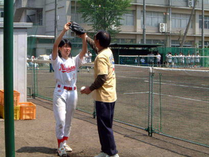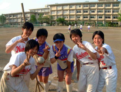 西浜中学校のソフトボール部を県立厚木商業高校に連れて行ったときの写真です。上の写真の左側が萩園中学時代に私が監督だったチームにいたエースで4番の鈴木祐美子選手。彼女は「厚商」ではレギュラーになるのに苦労しましたが、彼女の代は結局全国大会で3位の立派な成績を収めました。鈴木選手は中学時代のバッティング練習で、防球ネット越えのホームランを連発していた選手です。