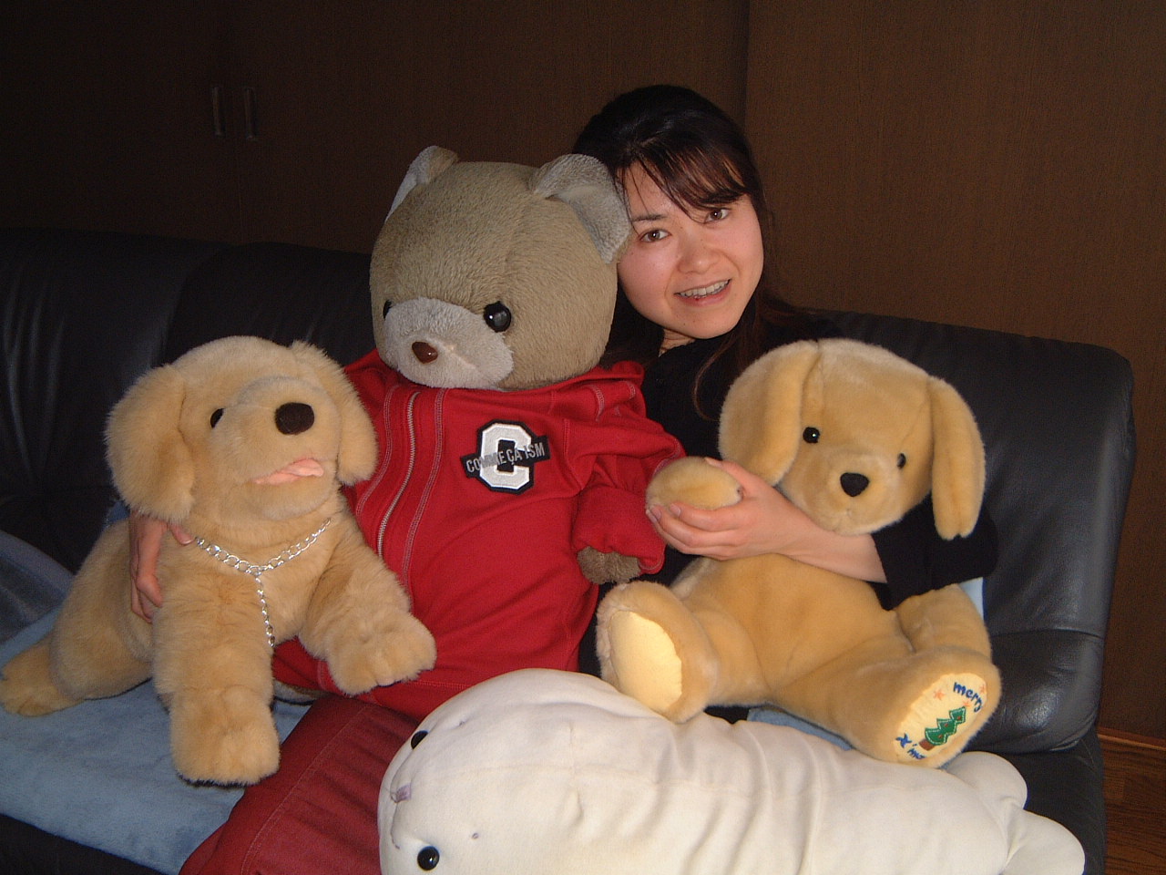 写真の佳代子の左 隣にいるのがクマで す。赤い洋服を着て、かわいいでしょう? クマは何着も服を持 っています。両隣は コロとサンタで、私 がクリスマスに買っ て上げたわんちゃん たちです。今では生 きた龍馬がいますから、ソファーには置いてはおけませんけどね。龍馬の格好の餌食になってしまうからです。