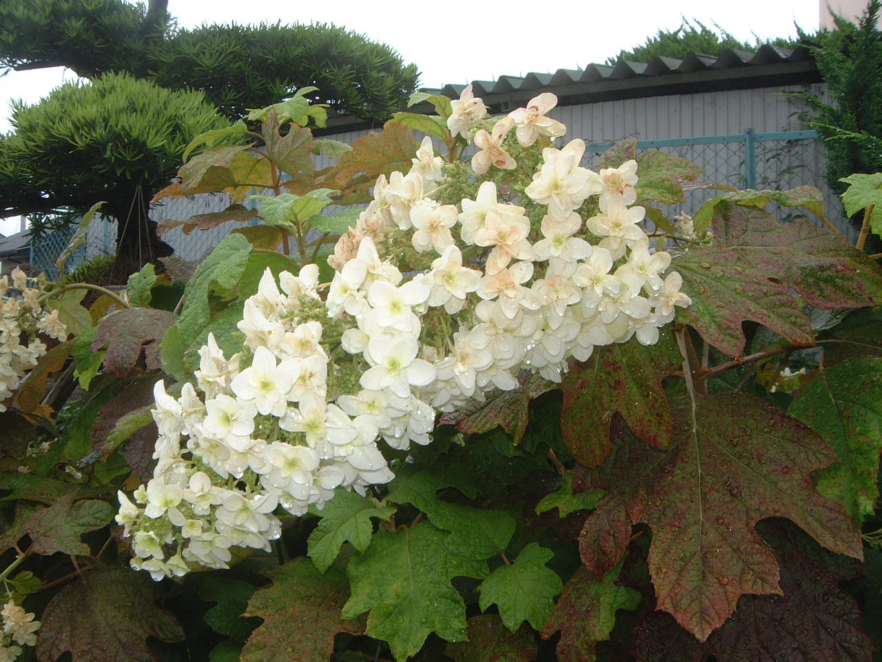 今の季節にはもちろん見ることはできませんが、梅雨の時期には、私と佳代子が一緒に小田原の近くの開成町で毎年開かれているあじさい祭りに出かけたとき買ってきた、柏葉あじさい(写真右の白いすずらんのような花)や、きれいなマリンブルーのあじさいが、年々多くの花をつけて、私たちの目を楽しませてくれます。