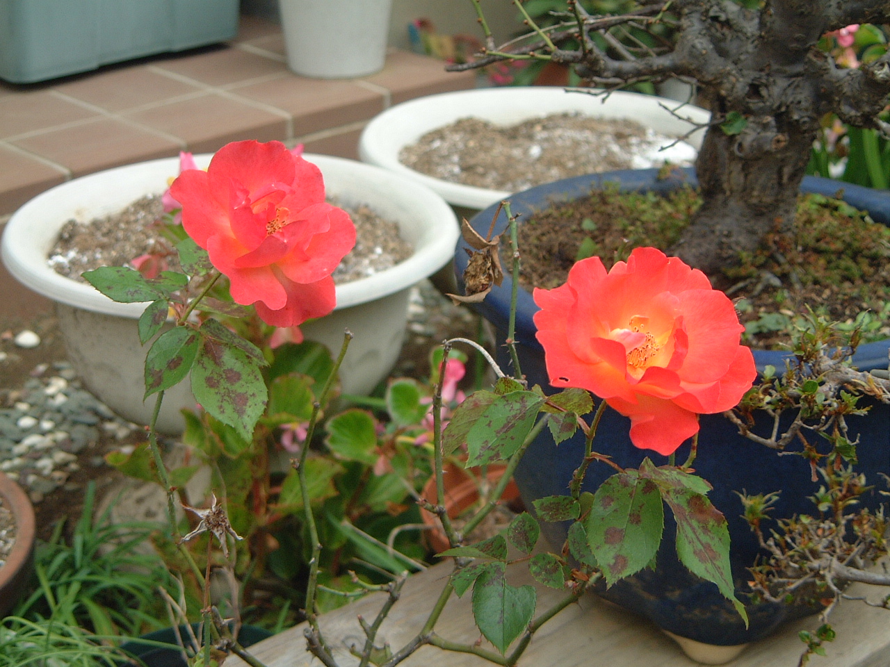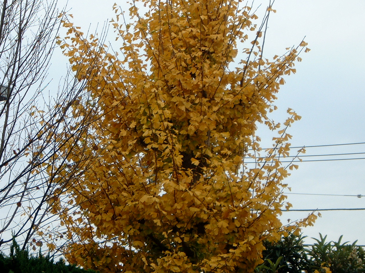これは我が家の南側 に見える黄葉した銀杏 の木です。佳代子は京 都の紅葉も大好きですが、色づく木々の葉の美しさにも非常に敏感です。愛犬龍馬のとなりに座ってときどきじっと眺めています。我が家の庭にも佳代子が愛する花々がいろいろと咲いています。玄関先には、母が作った菊の鉢が置かれていて、これも佳代子のお気に入りです。また、すぐ近くの叔母の家には立派なピラカンサが、たくさんの赤い実をつけています。