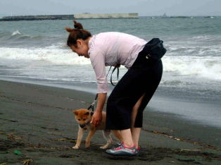 西中前の浜辺で愛犬龍馬も初めて海の散歩を