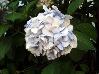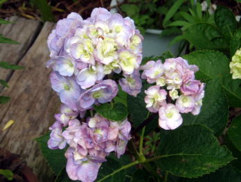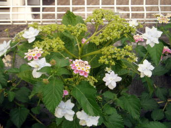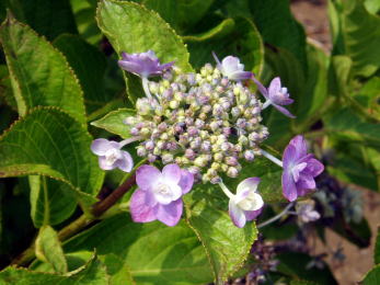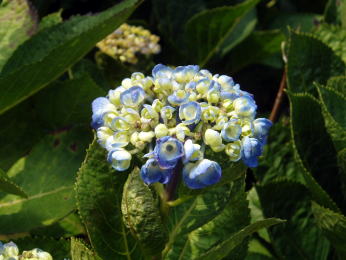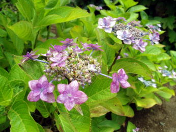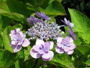 これは額紫陽花の一種であることは確かです。額紫陽花と言えば紫陽花の原種と言われている種類。江戸時代の日本に咲き誇っていたのは、この額紫陽花だったとされています。中央の小さな玉のようなものが花の部分で、周囲の大きな花びらに見える部分が額だそうです。薄いピンク色の額紫陽花はとても珍しいですね。この紫陽花は龍馬の散歩コースのあまり陽当たりの良くない場所に育っています。(2007年6月21日・夕方撮影)