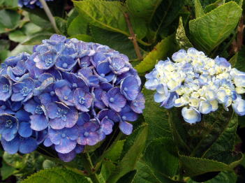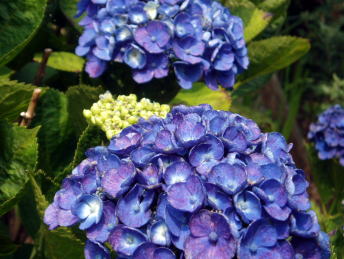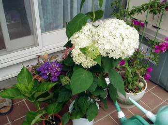 庭の紫陽花の色がだいぶ濃くなりました。紫陽花は開花の最後の段階になると、次第に色の濃さを増すのです。そして、遅れて咲き始めたのが、最後の写真に写っている「姫紫陽花」です。買ったときはピンク色だったのですが、薄紫色になっているということは、土壌が酸性であることを示しています。開成町の「あじさい祭」で買ってきた「アナベル」と「ベネチア」も美しいでしょう?来年は庭にしっかりと根付いているはずです。(2007年6月19日・午後撮影)