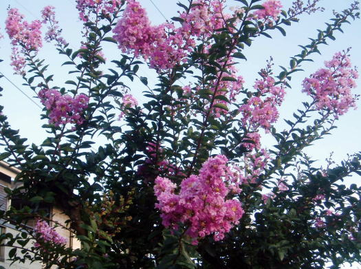 最近はぱっと目をひくような情景となかなか出会いません。紫陽花のシーズンも終わり、蒸し暑い日が続く中で景色までがけだるそうです。そんな中で龍馬を連れて夕方の散歩をしているときに、いつも通る小さな公園の中にこのサルスベリを見つけました。(2007年8月8日夕方撮影)