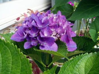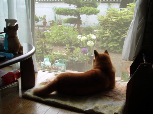 昨日の雨から一転して、今朝は素晴らしくいいお天気。水をたっぷり吸った紫陽花は、その美しさをさらに増しておりました。この色は来年もまた再現されるかどうかはわからないので、しっかりとデジタル画像に収めておかなければなりません。それほど広い庭ではありませんが、我が家の庭はとてもいい雰囲気を出してくれています。愛犬の龍馬は、こうしてリビングの大窓のそばに横たわって、庭を眺めるのが大好きです。(2007年7月5日・昼前撮影)