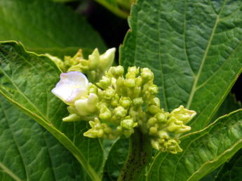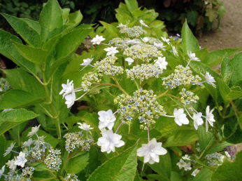 よく紫陽花の横に仲良く植わっているこの花は何という名前なのでしょう。よく見ると、花の大きさはかなり違うものの、花の構造は額紫陽花とよく似ています。これは山紫陽花の一種なのでしょうか。おわかりの方はよろしければ掲示板に書き込んで教えて下さい。(2007年6月15日・夕方撮影)