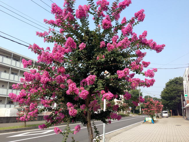 下は鶴が台団地のサルスベリの並木です。私が26年ほど前に鶴が台中学校に勤務していたときも、同じサルスベリの並木道だったかどうかは記憶に定かではありません。なぜか、並木の一番向こうの端の1本だけが白い花を咲かせます。サルスベリは毛虫などがたかることもありませんから、並木としては最適ですね。(2013年4月13・14日および8月11日・日曜日・朝撮影)※カメラはiPhone5のものを使用