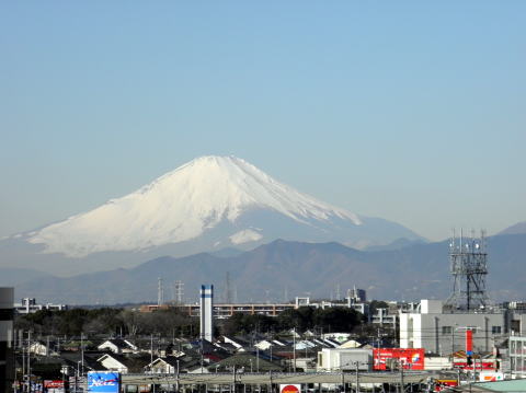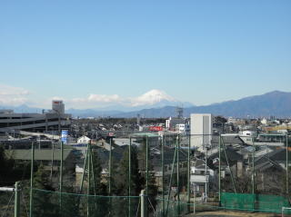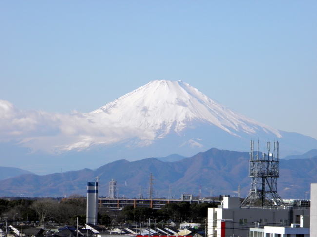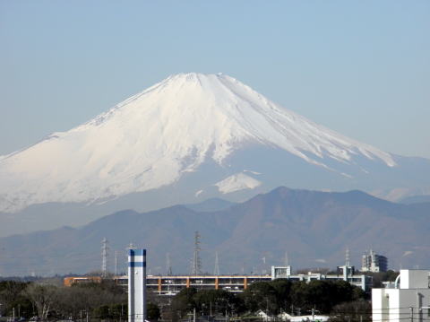 僕が勤務している横浜市立中田中学校は、屋上から眺める富士の姿が本当に素晴らしいんです。以前勤めていた茅ヶ崎市立西浜中学校は校舎から見る湘南海岸の風景が見事でした。西浜中からは富士の姿も望めましたから、本当に恵まれた環境でしたね。残念ながら中田中からは海は見えませんが(ほんの小さくなら相模灘が見えることもあるようですが)、大山・丹沢・富士と続く山並みはパノラマのように見ることができます。この日は少し雲がかかっていましたが、この次はくっきり見える富士の姿を撮影したいと思います。(平成25年1月4日・午前中撮影)