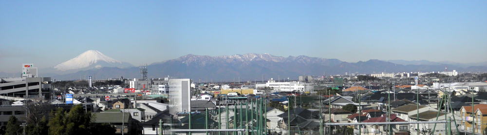 今回も、横浜市泉区の横浜市立中田中学校屋上から撮影した富士山と丹沢山系・大山の写真です。僕のカメラでもパノラマ撮影が可能なので、試してみました。この日は雲もかかっていないきれいな富士が撮影できると張り切っていたのですが、写真を見ると、1月4日の写真の方が空の青さが際だっていて美しいですね。また今度挑戦しましょう。(平成25年1月29日・朝撮影)