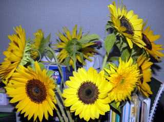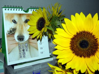 妻が、鶴が台団地に住む母親からもらってきたひまわりです。鮮やかな黄色の花が、部屋の中をぱっと明るく照らしてくれました。妻の注文で、龍馬のカレンダーと一緒にひまわりの撮影をしました。龍馬もひまわりのように家を明るくしてくれる存在です。太陽の花は、3月11日に大震災に見舞われた東北地方の被災地の方々に、大きな勇気を届けるのに相応しい花かも知れません。(2011年5月30日・夜撮影)