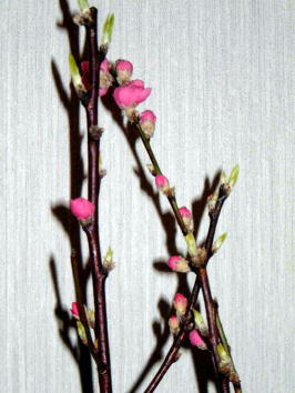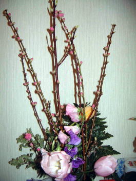 私が家庭教師で英会話を教えている小学校6年生の女の子がいます。彼女はこの4月から有名私立中学の英語で授業を受ける特別コースに合格して今は英会話の訓練に必死なのです。なぜなら、周りの子たちはほとんどが帰国子女で、彼らと一緒に授業についていくためには、海外在住経験のない彼女にとっては入学前に英語の聴く・話すの訓練を徹底的にしておかなければならない危機感があるわけです。その彼女のお母さんが、フラワーアレンジメントの仕事をされていて、桃の節句を前に、こんなにきれいなお花を下さいました。私は桃の花と梅の花の区別もつきませんが、濃いピンク色の花びらには「一目惚れ」状態でした。日本の花というのは本当に素晴らしいですね。写真なのが残念です。