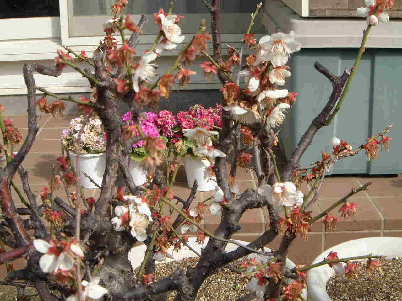 紫陽花はシーズンが終えて花が枯れたときに、枝分かれの1つめと2つめの間の茎の部分を裁断しておくことをご存知の方はどのくらいいるでしょうか。そうしないと、次の年にきれいな花をたくさんつけてはくれないばかりか、場合によっては一つも花をつけない場合もあるのです。私の家の庭のあじさいは今年も立派な芽をたくさんつけてくれました。今から3ヶ月後には彼らは見事な花となって私たちの目を楽しませてくれるのです。季節は確実に春を迎えようとしています。梅の花の季節もそろそろ終わりです。春を待ちこがれていた花々が活発に活動を開始しました。(2005年3月15日撮影)