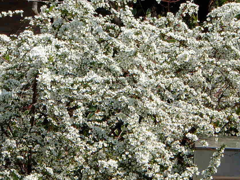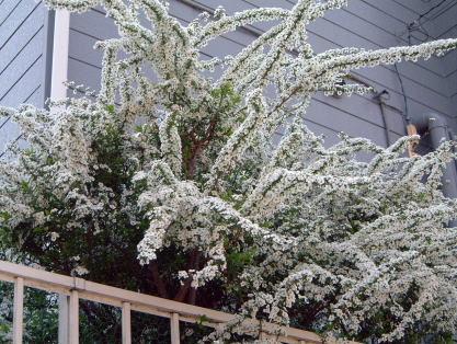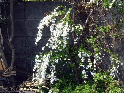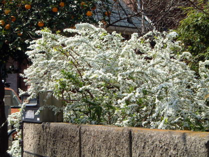 伊勢原のTさんから、先日の写真は「小手毬」ではなくて「ユキヤナギ」ではないでしょうかというご指摘がありまして、さっそくインターネットで確認してみたのですが、確かにユキヤナギに間違いないようです。言われてみれば、花が柳のように垂れ下がっていますね。小手毬や大手鞠は、ボールのような形に花が固まっているので、明らかに違います。そしてTさんのお話では、戸外にある小手毬や大手鞠は、まだ時期的には開花のシーズンではないそうです。鉢植えの場合はもう開花しているようですが、戸外の場合はまだつぼみをたくさんつけている状態だそうです。今度は小手毬や大手鞠を何とか探してみたいと思います。しかし、写真を見てすぐに名前を教えていただけるというのはとても有り難いことですね。伊勢原市のTさんは生花を扱って、フラワーアレンジメントなどを手がけていらっしゃいます。これからもとんでもない勘違いがあったら、ぜひ教えてくださいね。(2005年4月3日朝撮影)