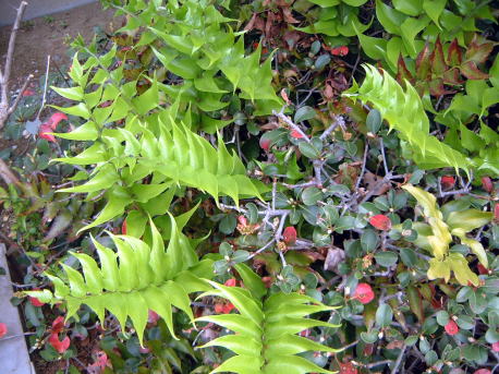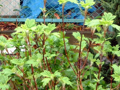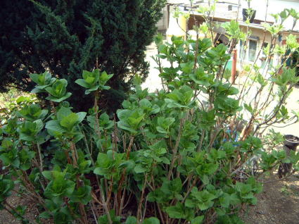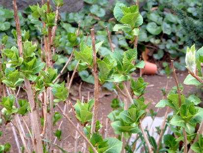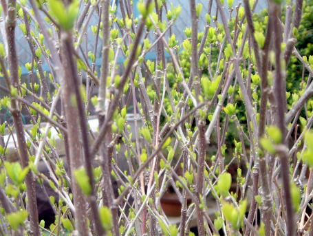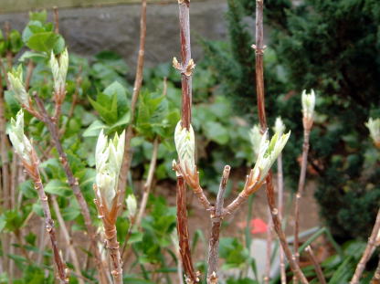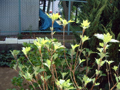 よく見ないとわからないかも知れませんが、我が家の庭のあじさいが花芽を持ったのです。一番右の紫陽花が去年植えたばかりの母の紫陽花なのですが、母の心配をよそにしっかりと花芽をつけてくれました。紫陽花は、花が終わった後に決まった場所を裁断することで翌年の花芽がつくかどうかが決まります。(2005年4月30日昼前撮影)