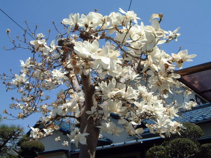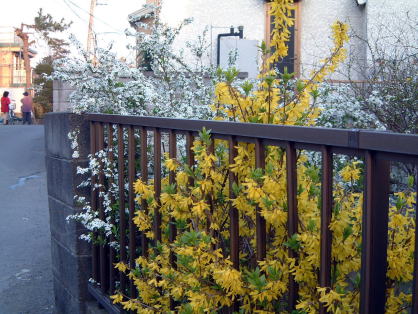 これは龍馬の朝の散歩のときに見かけた「こでまり」か「おおでまり」ですね。近所の風景はもうすっかり春バージョンになっています。今年は桜の開花もちょうど学校の入学式のあたりが満開になるそうです。(2005年4月1日撮影)