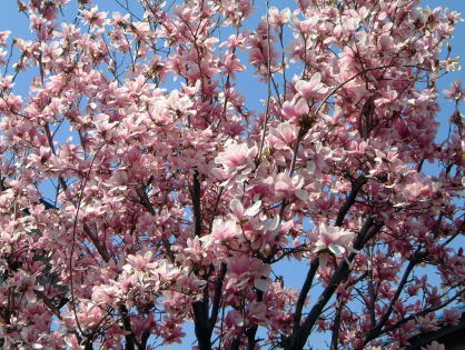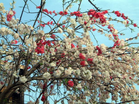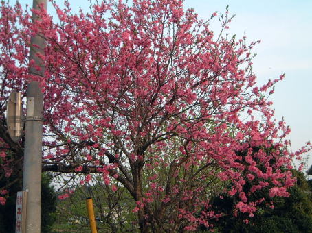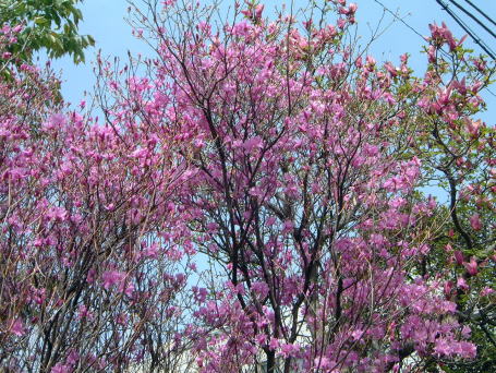 海老名の宮澤病院からの帰り道、大岡越前の守忠相で有名な大岡家の菩提寺である浄見寺(茅ヶ崎市堤)の近くの道ばたに咲いていた美しいピンク色の花をたくさんつけたこの木は桃の木でしょうか。それとも遅咲きの八重桜?でも八重桜が満開になるにはちっと時期が早すぎますよね。私はどうしても濃いピンク色の花に心惹かれてしまいます。(2005年4月17日撮影)