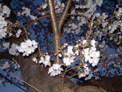 夜のライトに浮かぶ桜もなかなかおつなものです。本当にもう満開なのですね。もってあと1週間でしょうか。せっかく美しく咲かせた花なのですから、もっともっと長い間咲かせておいてあげたい気がします。長い冬をじっと耐えてやって芽吹いたのですからね。