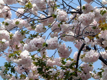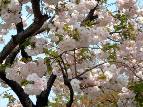 京都では「花いかだ」と言って、桜の花びらが川面にたくさん浮いてそれがまるでいかだのようになって流れて行く季節です。妻が言うには、ソメイヨシノのはかなさも桜らしくていいということですが、私はどちらと言えば、この見事な八重桜の咲きっぷりの方が好みに合っています。ちょうどこの桜の木のそばに信号機があるので、赤信号で止まったトラックの運転士さんも、桜のあまりの美しさに携帯電話のカメラのシャッターを切っていたそうです。