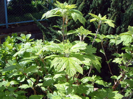 庭の柏葉あじさいの葉っぱはこんなに立派になりました。本当に驚くべき成長の早さです。雨の季節の植物だけに、本当に「雨後の竹の子」状態でめきめき成長するのでしょうね。あじさいは5月にはもう花をつけ始めます。土壌の酸性度・アルカリ性度で色合いに変化が生じるそうですが、柏葉あじさいは白いすずらんのような花なので問題はなく、むしろがっかりしたのはその隣のマリンブルーのあじさいでした。買ったときの美しいマリンブルーは濃い青に変わってしまいました。