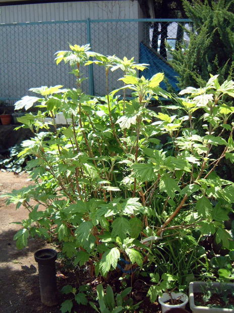 我が家の庭もすっかり春らしくなってきました。前回撮影したときよりも、あじさいの芽もずいぶん成長したのがわかりますね。左下の柏葉あじさいはスズランをもっと巨大にしたような素晴らしい白い花房をたくさんつけてくれます。またその時期になったら写真で紹介しましょう。(2005年4月2日朝撮影)