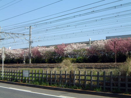 JR東海道線の辻堂駅から藤沢駅に向かって少し行ったところに、線路の南側に松下電器の工場があるのですが、そこの桜並木がものすごくきれいなのです。そして、写真にあるように東側の半分はどうも八重桜らしく、白とピンクの桜の木が交互に植えられていて、人目をひきます。本当に美しい眺めなのです。(2005年4月22日午後撮影)