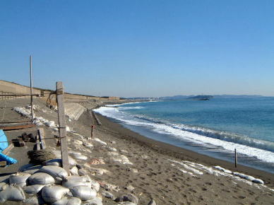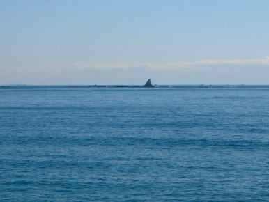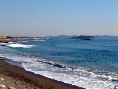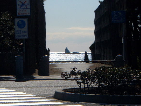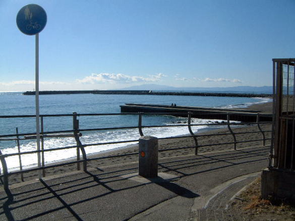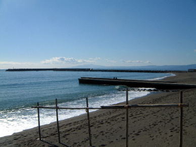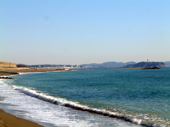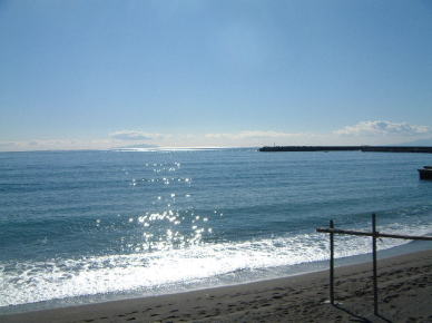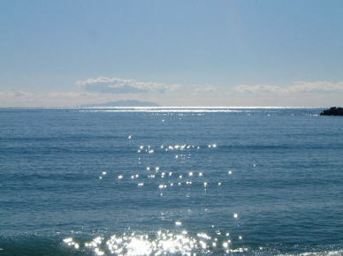 何と美しい景色なんでしょう。自分の故郷であるにもかかわらず、ここ数ヶ月ずっと行っていなかった湘南海岸です。東を見れば江ノ島から鎌倉・逗子方面までが一望でき、南の正面には烏帽子岩が、そして南西方向に目をやれば遠く大島を望むことが出来、西に目をやればサザンビーチ茅ヶ崎の背景に箱根の山々から伊豆半島までが一望できる絶景の地なのです。夏は遠方から足を伸ばす観光客でごった返している海岸も、冬は人影もまばらで海も静かです。陽光にきらめく海面がなんとも美しく、しばらくその場に立ちすくんでしまいます。砂浜の浸食が進んでいるのが少々残念ですが。(2005年12月27日午後撮影)