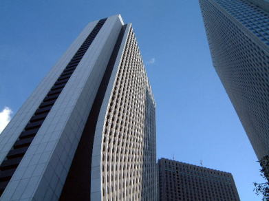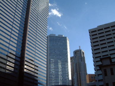 日本の建築技術の粋を尽くした新宿の高層ビル街。ここは西新宿の一角です。この高層ビル街には、耐震データ偽造の建築物などは恐らく存在し得ないでしょう。街並みは非常に明るく、またゴミなども散乱しておりません。車の通りは多いのですが、道が広いのでそれほどごみごみした感じを受けることはありませ。高層ビルは青空を背景に美しくそびえ立っています。こういう風景もたまにはいいですね。(2005年12月24日・クリスマスイブ撮影)