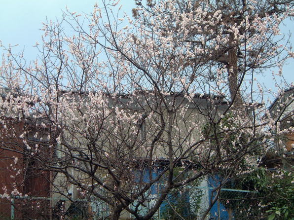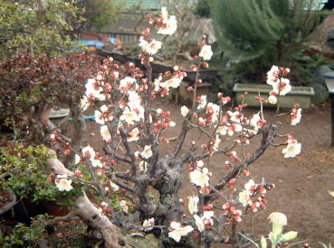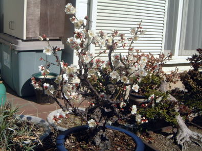 我が家の庭に置かれた鉢植えの梅の木です。毛虫が苦手な私は、梅も桃も桜もちょっと苦手な時期もあるのですが、それぞれに花の魅力がありますね。梅はきりっとした凛々しさと清楚さがありますし、桃には深いあでやかさがあるような気がします。そして桜には可憐さとはかなさがある。私は桃の花の濃いピンク色が一番好きですが、梅の花の白い清楚さには別の意味でとても惹かれます。自然は確実に春を迎えつつあります。(2006年2月7日昼撮影)