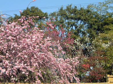 桜の花のように見えますが、3月の中旬ですし、これは明らかに梅の花ですよね。最近は花の色が似通っているので梅と桜の区別もできなくなってしまいました。右の写真はピラカンサではありませんよ。これも梅の木だと思います。鮮やかな赤い色が美しかったのですが、撮影した時間が夕方で光量が足りなかったので、今度はつぼみが開いた頃に明るい太陽光の下で撮影してみたいと思います。(2006年3月12日夕方撮影)