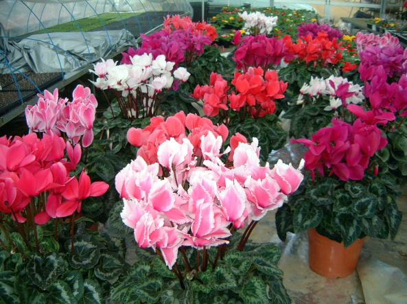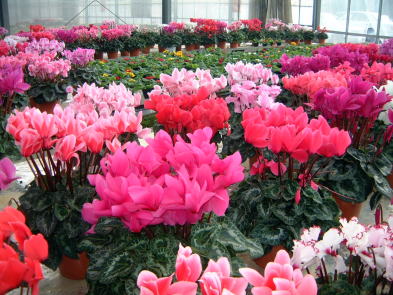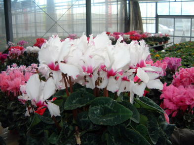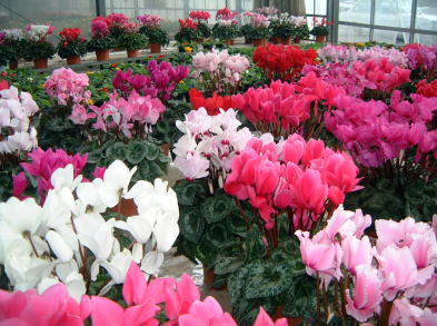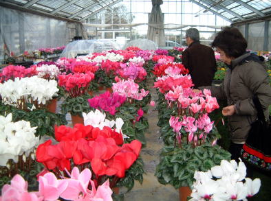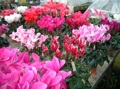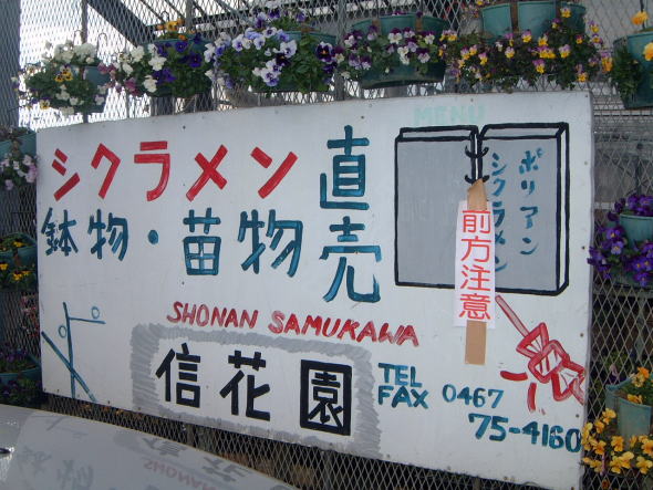 寒川神社から5分ほど歩いたところにある寒川町宮山の「信花園」(電話:0467−75−4160)では大量のシクラメンを栽培しています。最後の方に出てくる苗床がありますね。実はこれがシクラメンの苗なのだそうです。3ヶ月毎に植え替えをして13ヶ月で立派な鉢植えになるのだそうです。ここに写っているシクラメンはほとんどが大きな6号鉢ですが、それで値段は何とたったの2,000円。街の花屋さんで買えば3,500円以上はするような代物ばかり。皆さん、お時間があればぜひ寒川町宮山の「信花園」まだ氏を伸ばしてみてください。ビニールハウス4つを使って、きれいなシクラメンを大量に育て、直売しています。最近は花びらがひだになった珍しい品種も強さを増したそうで、どのシクラメンもたくましく育つそうですよ。(2006年1月8日昼過ぎ撮影)