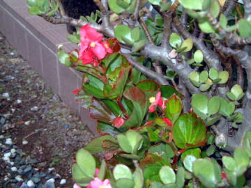 我が家の庭は今はベゴニアがあちこちに咲いております。これベゴニアでいいんですよね。間違っていたらまた後で訂正しますね。ベゴニアは丈夫な花で有名。生命力に富んでいるんですね。右上の鉢植えは私が以前ちょっと道路に出っ張っていたのを失敬してきたガクアジサイです。大きくなったでしょう?これなら来年は立派な株に成長してくれることでしょう。(2005年10月26日夕方撮影)