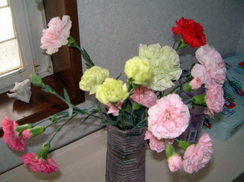 「癒しのフォトギャラリー」のページに、我が家のトイレの切り花を載せるのはちょっと申し訳ないかなとは思いましたが、実は珍しい色の(薄いグリーン)カーネーションが飾られていたので、シャッターを切っておいたのです。