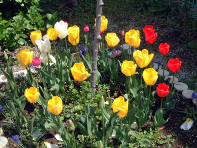 最近はきれいなチューリップを植えている場所も多くなりましたね。そして遅咲きの八重桜が満開の準備をしておりました。菜の花もきれい咲いていて春を感じさせるのですが、季節は確実に新緑の5月に向かっているような印象を受けました。(2006年4月17日朝撮影)