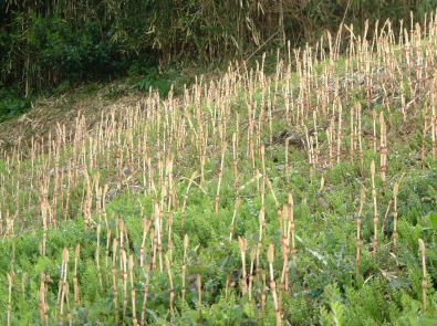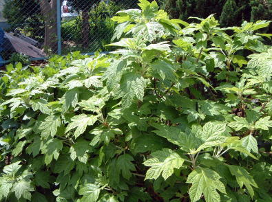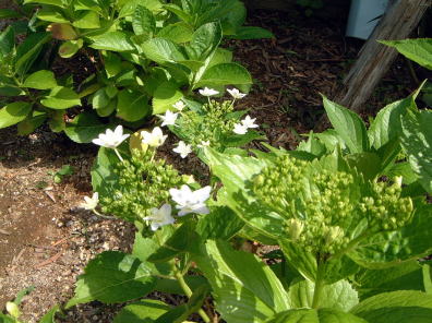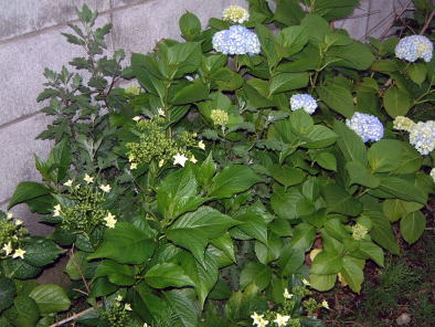 この写真ではあまりよくわからないかも知れませんが、今年の柏葉紫陽花はものすごい大きさに成長しています。去年の1.5倍に株が大きくなっているでしょうね。そして毎年周囲の土からは小さな株が姿を現します。その株が近所にお裾分けされるんです。今年も小田原の開成町では「あじさい祭」が開催されるでしょう。でも開成町でも我が家の柏葉あじさいを超える大きさの株はないんです。開成町から来た柏葉なんですけどね。(2006年5月7日・午前中撮影)