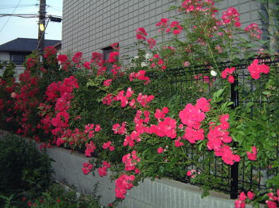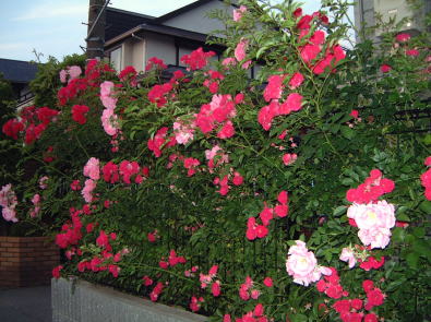 今日の夕方の散歩は、母と妻と私の三人で龍馬を連れて出かけました。途中で「菊次郎君」という7ヶ月の柴犬の雄と出会ったのですが、菊次郎君の方が龍馬を気に入ってしまって、弟子入りとあいなりました。写真は私がいつも夕方の散歩のコースで見る紫陽花とバラの生け垣です。バラは見事ですね。この家の人の繊細な庭造りの感覚が手に取るようにわかります。紫陽花はどうやら日光の当たり具合で、早めに咲いたり遅く咲いたりするようです。我が家の庭の紫陽花はまだ咲きかけで、満開になるのはどうやら6月の初旬になりそうです。今度は天気のいい日の昼間に撮影したいですね。(2006年5月28日・夕方撮影)