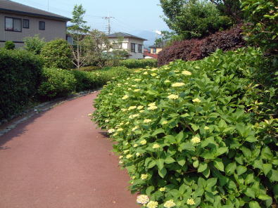 今日は7月下旬の陽気だったとか。小田原高等看護専門学校の授業が朝入っていたのですが、小田原に早く着きすぎてしまったので、講師控え室に荷物を置くと、デジカメを持って散歩に出ました。ちょうど看護学校の裏手に当たる場所にきれいに整備された散歩道が造られていて、あじさいがたくさん植わっていました。陽当たりが良すぎるのか紫陽花はまだ色を付けてはいませんでしたが、満開になればかなり美しい光景を見せてくれることでしょう。(2006年6月1日・朝撮影)