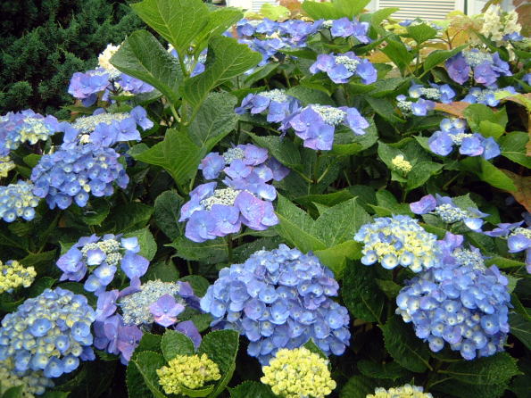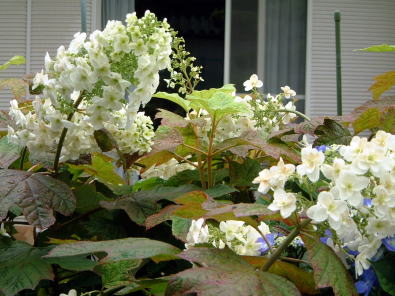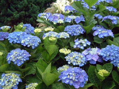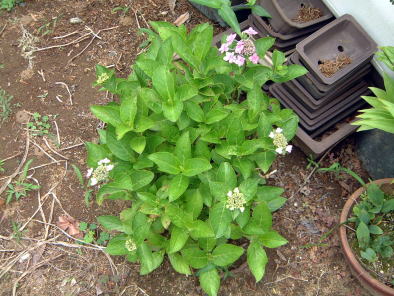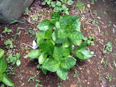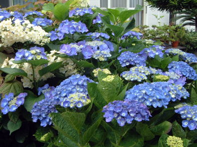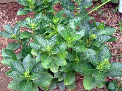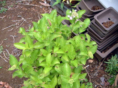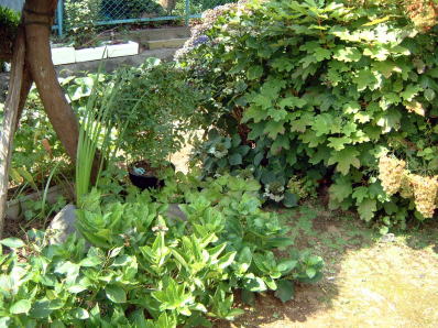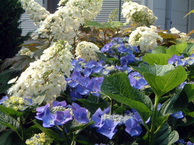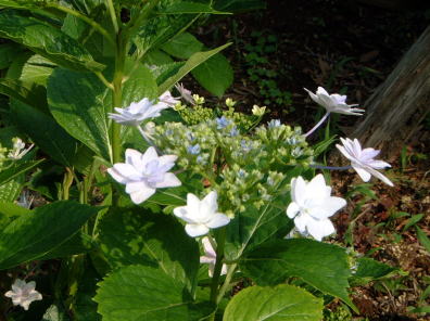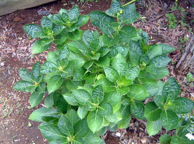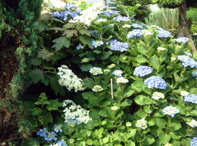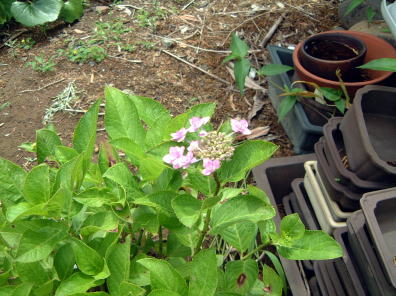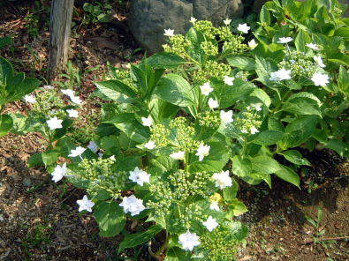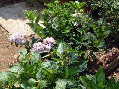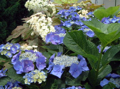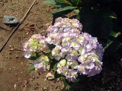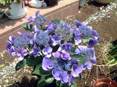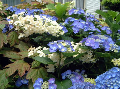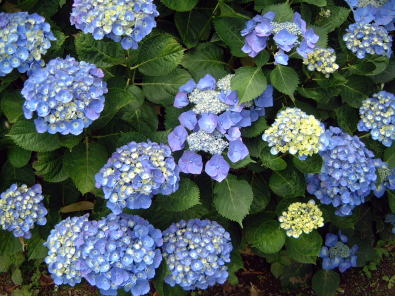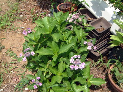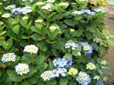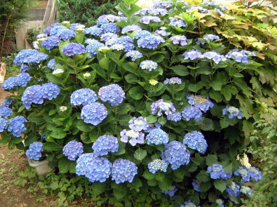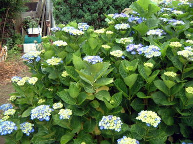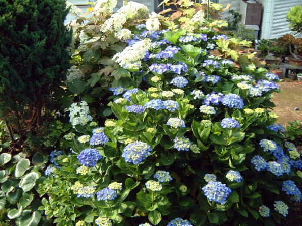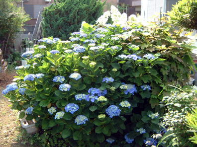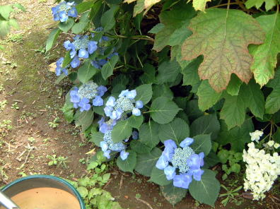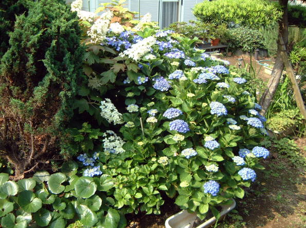 似たような写真にばかりなってしまいましたが、梅雨の晴れ間は少ないと思ったので、我が家の庭の今年の素晴らしい青さを画像に収めようと努力してみました。土の質が去年より少し変わったのか、青が更に濃くなって魅惑的な雰囲気を漂わせています。となりの柏葉紫陽花の白い花とのコンビネーションが抜群で、絵になりますね。他の紫陽花の株はご覧の通り、「隅田の花火」以外はまだこれからです。「隅田の花火」も先日まではあまり元気がなかったのですが、母が根の周辺に牛糞をまいたらごらんのとおりしゃきっとして来ました。ピンク色の紫陽花は「城ヶ崎」の原生種です。来年はもっと見事に咲いてくれるでしょう。(2006年6月17日・朝撮影)