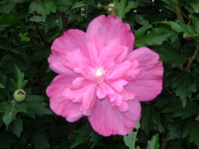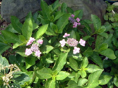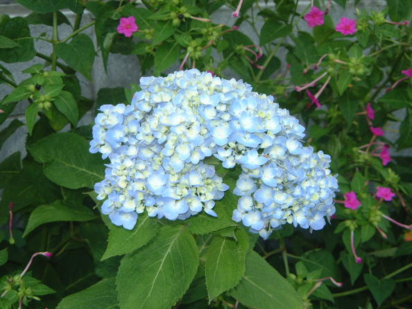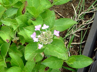 我が家の庭でひときわ異彩を放っているブルーマリン・額紫陽花の青・柏葉紫陽花の集まった大きな株とは別に植えられた紫陽花たちが、ようやく元気いっぱいになってきました。時期がずれたのですね。今頃花芽を持つものもあったりで、それは今年の天候異変を物語っています。新しく仲間入りしたのは普通の紫陽花で鮮やかなピンク色のもの。ご覧の通り我が家の庭の紫陽花たちにはピンク色のものが少ないのです。それから「アリラン」と呼ばれる紫色の額紫陽花。両方ともとても値段が安かったのですよ。ピンク色のものが398円でアリランが680円です。このくらいの値段で鉢植えの花が買えるというのは、癒しの必要な時代にあって実にありがたいことですね。花の時期が終わって庭の土に植え替えてしまえば来年の花はまた別の色になってしまうでしょうが。(2006年6月22日・朝撮影)