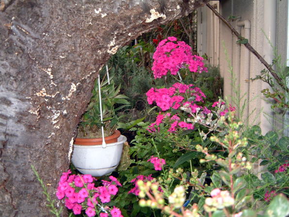 庭の鉢植えに凝る人はずいぶん増えて来ましたね。今日などは、庭で涼めるように、パラソルを立てていました。そのお宅も鉢植えの花には非常に凝っていて、いつも散歩のときに楽しませてもらっています。鉢植えではなく大きな木を庭に植える人も多く、街は小さな植物園のようになってきていますね。これも、自然と常に接していたいという人々の欲求の表れです。(2006年8月13日・朝撮影)