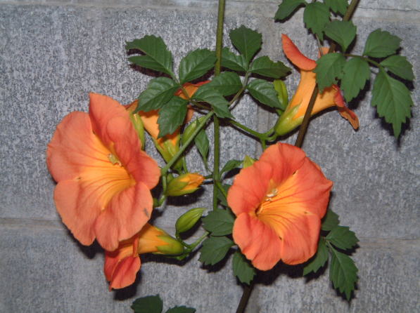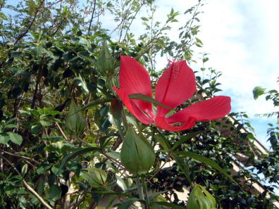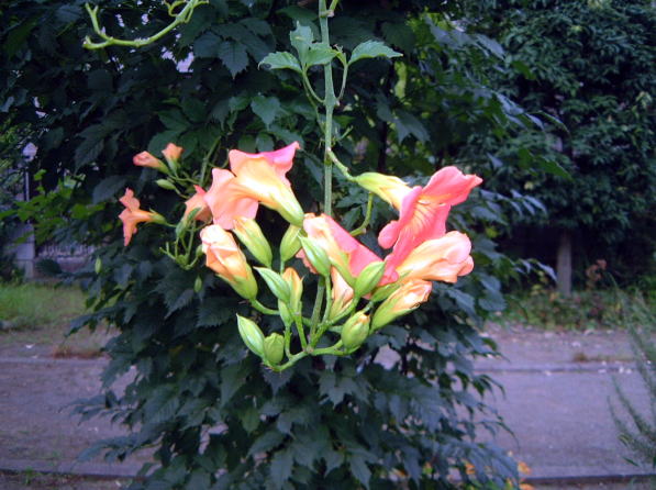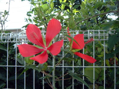 これは芙蓉の花でしょうか。だとしたら、とても珍しい色ですね。芙蓉と言えば赤い芯のある白い花、薄いピンクの花、濃いピンクの花などをよく見かけますが、オレンジ色はめったに見かけません。まるでハイビスカスのようですね。(2006年8月4日・夕方撮影)