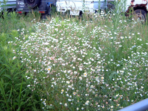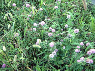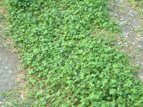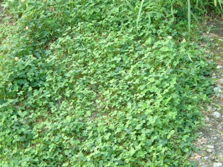 依頼されていたシロツメクサが一面に生えている草原は、やはり今年は茅ヶ崎市内にはありませんでした。左の写真に写っているのは、駐車場のほんの一部に群生したシロツメクサで、どこもせいぜいこの程度。他の草原は別の花に占領されているのが現状です。