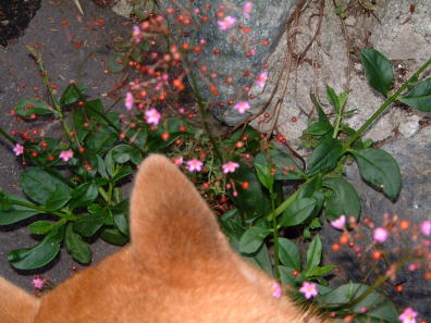 自然に群生するかすみ草でしょうか。先日はフラッシュの中で撮影したのでちょっと雰囲気が出ませんでしたが、今日はまだ夕方も早かったので自然光で撮影することができました。私はこのかすみ草が大好きです。控えめでいて美しい花ですよね。オレンジ色の花はやはり名前がわかりません。(2006年8月6日・夕方撮影)