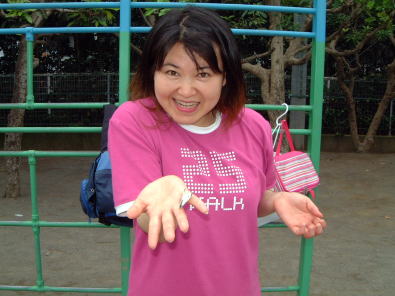 ソフトボールの試合の応援に来てくれた妻でしたが、途中で大騒ぎしているのです。私はもうネクストバッターズサークルに入っているというのに、試合そっちのけで大騒ぎ。どうしたのかと思えば、手に蝶々が止まったと言うのです。本当でした。でも蝶々はどうやら弱っていたようです。私は、仕方なくネクストバッターズサークルから抜け出して、デジカメを手に妻と蝶々の写真を撮りました。ちなみにその直後の打席はサードゴロでした。(2006年6月25日・昼前撮影)