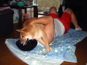 龍馬はもうすぐ2歳になる今でも家族の私たちにだっこされるのが大好きですが、こうして小さい頃の写真をチェックしてみると、この子はありとあらゆる場面で家族の誰かからスキンシップをたくさん受けていたことがわかります。人間の赤ちゃんを育てるときにもスキンシップを大切にしなければならないと言われますが、龍馬の落ち着いた性格は小さい頃の家族とのスキンシップに原因があったのではないでしょうか。彼はみんなから愛されているという安心感があるのでしょう。途中に出てくる男の子は私の弟の長男です。彼はそんなに犬が得意ではないのですが、龍馬と接するうちに大の仲良しになりました。龍馬が大きく見えますね。