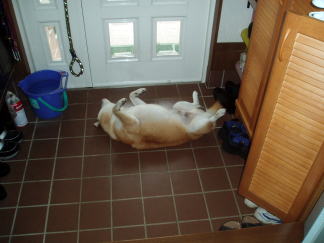 最近は甘え方が以前に増して激しくなった感じの龍馬です。そばに寄ってきたかと思うと、すぐに背中を見せて座ります。「背中をさすってよ」という合図なんですね。こちらが気がつかずにいると、わざと目立つポーズをして「ワンッ!」とひと吠えします。意思表示の方法が巧みになってきました。背中やお腹を刺すってもらっているときの龍馬の表情を見て下さい。この顔見たらついつい…。(2007年8月3日夜・6日夜撮影)