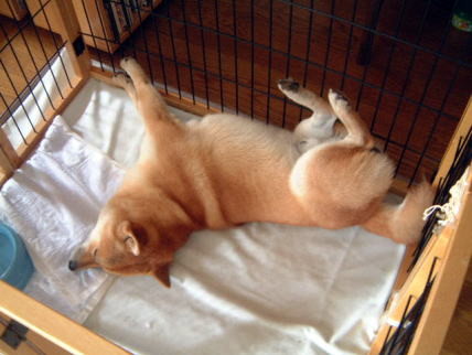 朝の散歩から帰ってくると、疲れるのでしょうね、龍馬はたいていは昼過ぎまでお昼寝に入ります。本当によく眠りますね。小さい頃は人間の赤ちゃんと同じだから寝るのは当たり前だと思っていたのですが、基本的に犬は夜行性で夜は熟睡していないのでしょうね。ちょっと物音がしても番犬として家を守っている意識があるでしょうから、昼間安心できる時間帯にたっぷり睡眠をとるようになってしまうのだと思います。「寝る子は育つ」と言いますが、犬にもまさにそれがあてはまって、龍馬はすくすく成長しています。(2005年7月8日昼過ぎ撮影)