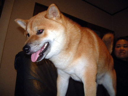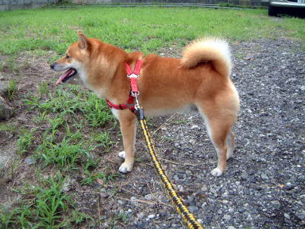 こうしてだっこされている龍馬を見ると、本当に大きくなったなあと思います。体重は13.5キロ前後で安定しているのですが、体格は着実に大きくなってきています。顔がしっかりしてきましたね。私たちをときどきちらっと横目で見るときの視線などにも、大変な知性を感じるようになりました。朝の龍馬は、散歩に連れ出されると察知すると、なぜか部屋中を逃げ回ります。どうもハーネスをつけられるのが嫌らしいのです。そして都合が悪くなるとすぐにダイニングキッチンのテーブルの下に逃げ込んでしまいます。(2005年7月15日朝散歩前に撮影)