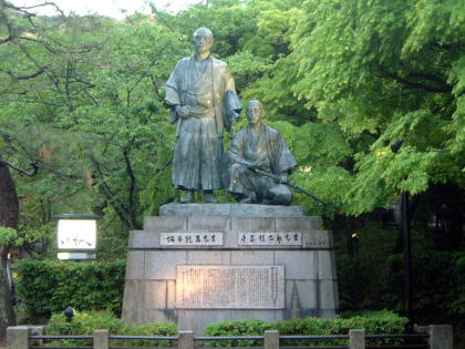 円山公園にある坂本龍馬と中岡慎太郎の像は有名ですね。霊山護国神社にある二人の墓碑は、ちょうど京の街が見渡せる最高の位置に立てられていて、二人とも本当に京の街を愛していたのだということを痛感させられます。あちこちに隠れ家を持っていた龍馬も、結局は京の街で暗殺されてしまうのですから、歴史というのは非情なものです。二人が生きていたら、明治維新後の日本はもっと早く近代化(精神的に)されていたのではないでしょうか。実際には龍馬たちが夢に描いた「全ての人間が平等に扱われる自由な世界」は実現しなかったわけですからね。