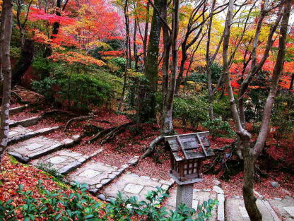 後半の3枚の写真は、別のサイトから承諾を得てお借りしたものですが、私たちが訪ねたのはこんな美しい紅葉を見ることができるもう少し前の時期だったようですね。常寂光寺にはゆっくり半日くらいいても、絶対に飽きることはないでしょう。