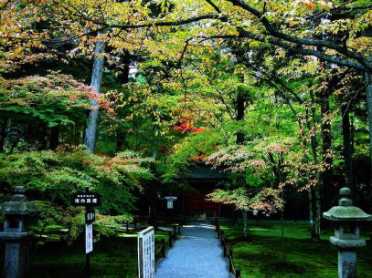 この大原は王朝の昔、「天台声明(てんだいしょうみょう)」の精舎が立ち並んでいたそうです。「声明」(別名「梵唄」ぼんばい)とは御仏を礼賛する仏教音楽のことです。朝霧のたちこめる大原の里に声明が流れていた様を思い浮かべてみてください。やがてこの地は中国の声明聖地の名をもらって「魚山」と呼ばれるようになります。三千院は、49を数えた魚山を司る政所(まんどころ)として12世紀の中頃に建立されたのだそうです。三千院の別名は梶井門跡、梨本門跡、円融院門跡などで、天台宗五箇室門跡の一つ。開基は伝教大師最澄上人(767〜822)で、本尊は薬師瑠璃光如来(秘仏)です。現在では樹齢何百年にもなる杉木立と、鮮やかな緑色を披露してくれる苔、そして秋の紅葉で有名になっています。